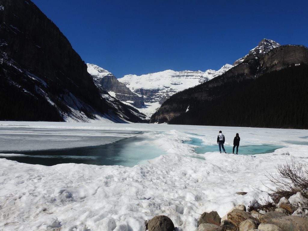 We have been to Lake Louise quite a few times and always done the walk around the lake so this time I suggested we try the walk up to Mirror Lake. Unfortunately I chose the only year that Lake Louise was frozen over. As you can imagine, the path up the mountain was covered in thick snow and ice. It took us an hour and a quarter to climb up there, we rested for ten minutes and even longer to climb back down. There were others on the trail in trainers so we felt quite well prepared, although there were some people in hiking boots and who had rucksacks and walking poles. I have to say a bottle of water would have be very welcome – we shared a couple of Werther’s Originals instead!