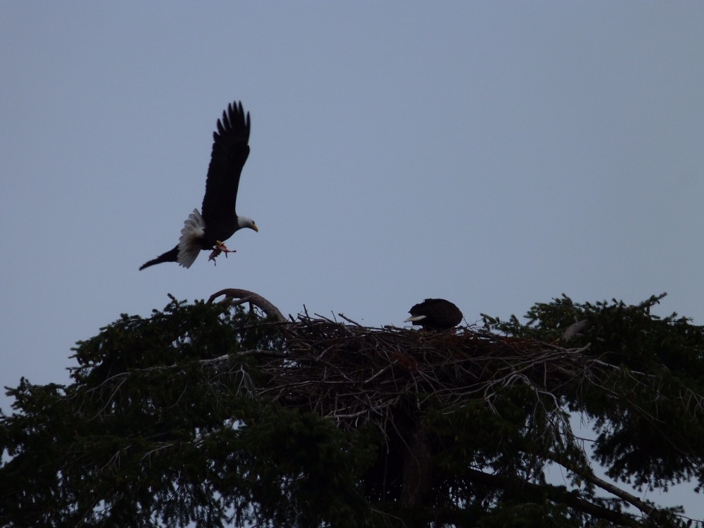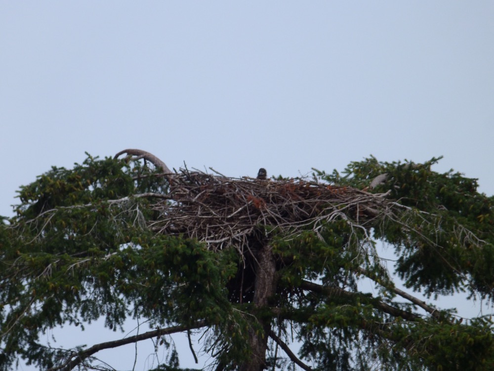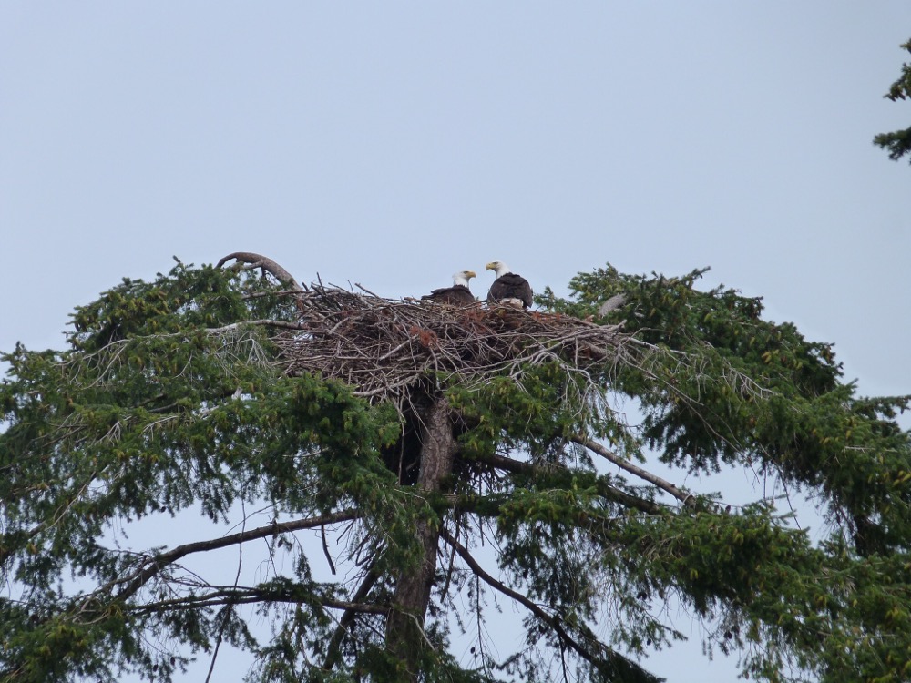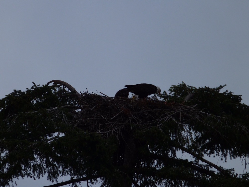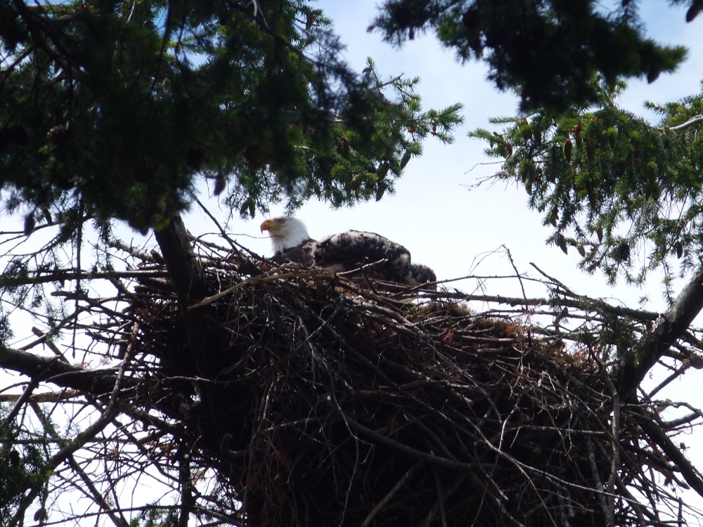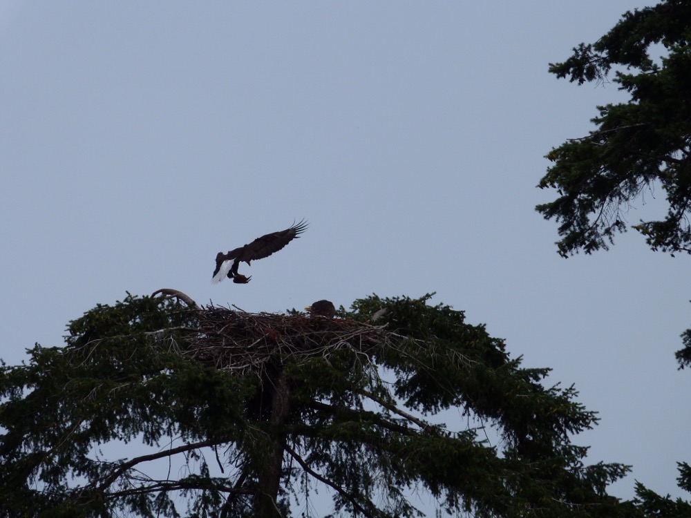 What a wonderful day. The weather was perfect and we did one of our favourite walks in Port Alberni and then had lunch in the Clam Bucket. Decided to pop in to see the Eagles before going home and I’m so glad we did eye put on a show for us followed by another put on by Mummy Merganser and her ducklings. Didn’t think the Eagles were going to do anything but mum eventually appeared, junior popped his head up and then daddy brought something to eat. Then he kept coming back with more! Incredible. The mum then spent a while feeding the baby – although he looks as big as his parents and certainly big enough to feed himself! Mum must have then sent dad out for new bedding as he then appeared with a tree branch and spent a while repairing part of the nest.