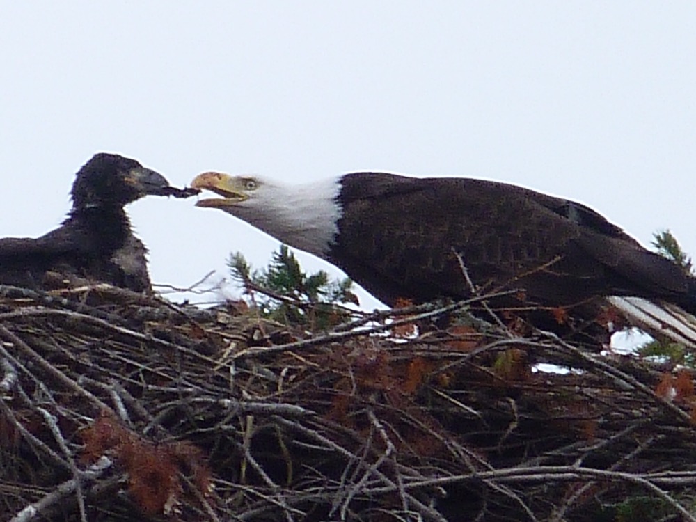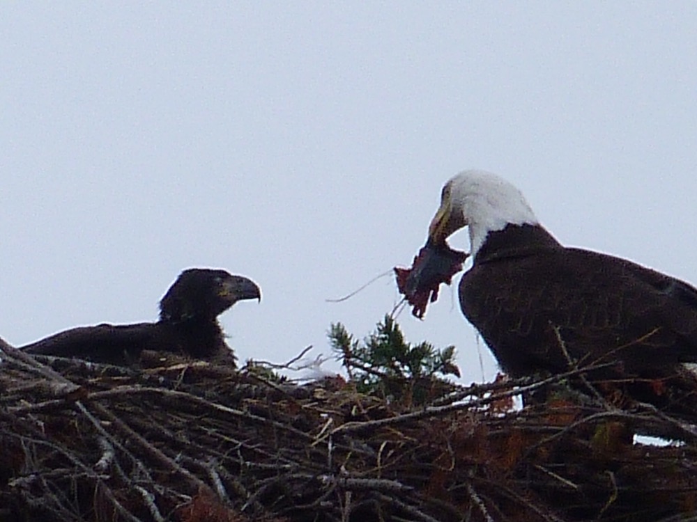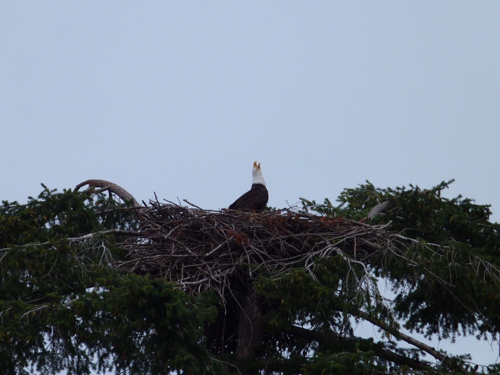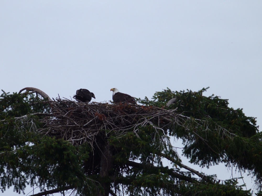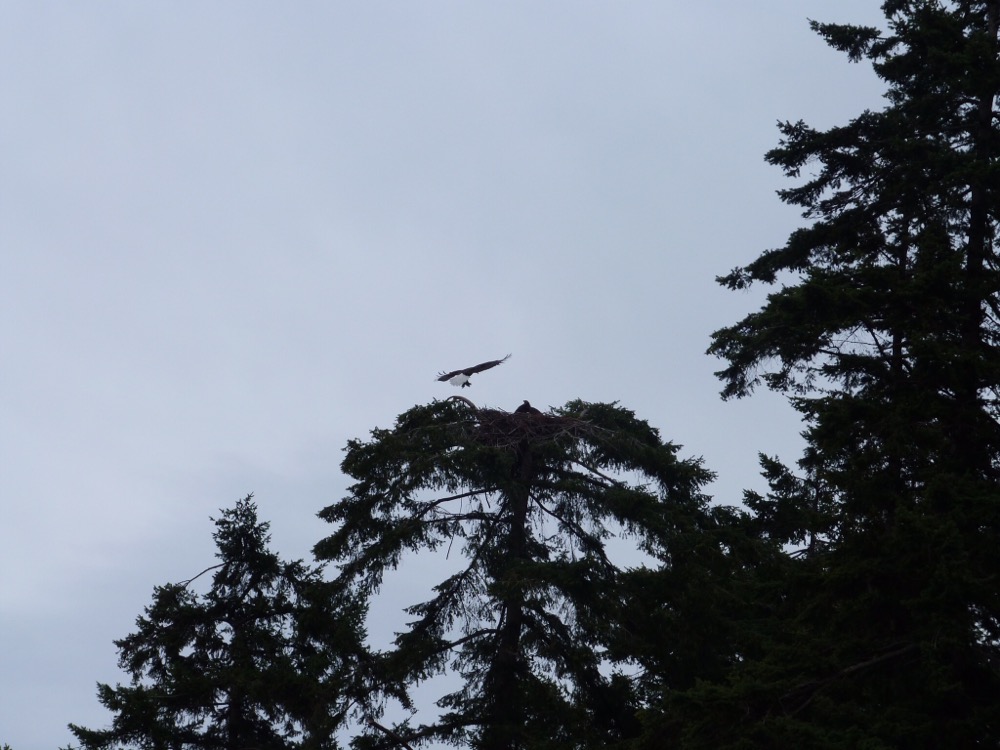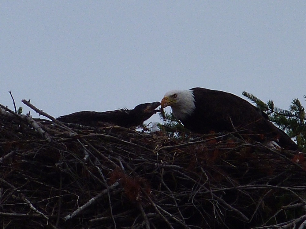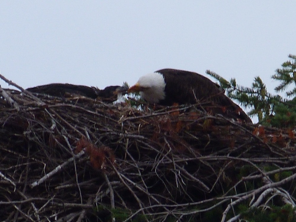 What a wonderful day. The weather was perfect and we did one of our favourite walks in Port Alberni and then had lunch in the Clam Bucket. Decided to pop in to see the Eagles before going home and I’m so glad we did eye put on a show for us followed by another put on by Mummy Merganser and her ducklings. Didn’t think the Eagles were going to do anything but mum eventually appeared, junior popped his head up and then daddy brought something to eat. Then he kept coming back with more! Incredible. The mum then spent a while feeding the baby – although he looks as big as his parents and certainly big enough to feed himself! Mum must have then sent dad out for new bedding as he then appeared with a tree branch and spent a while repairing part of the nest.
