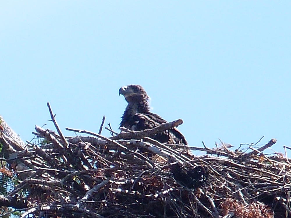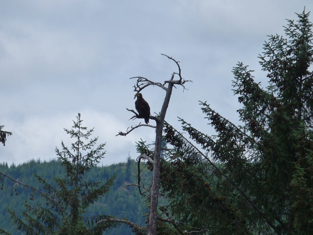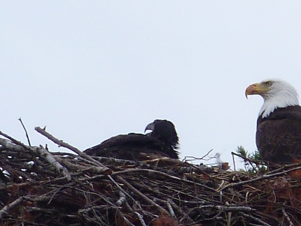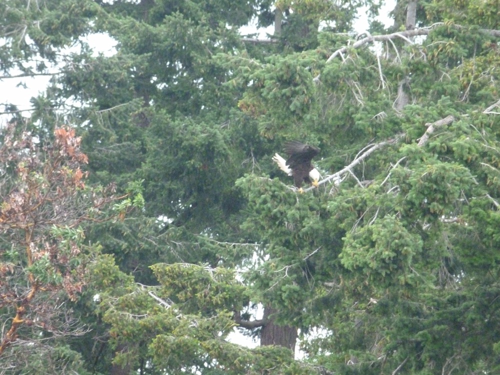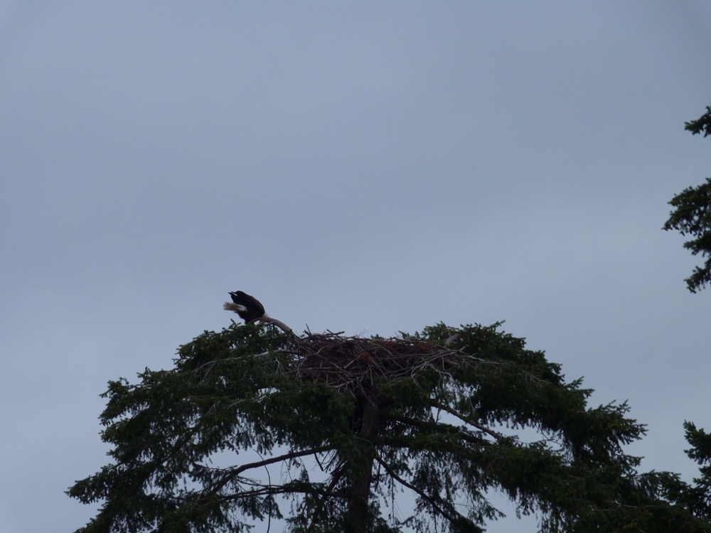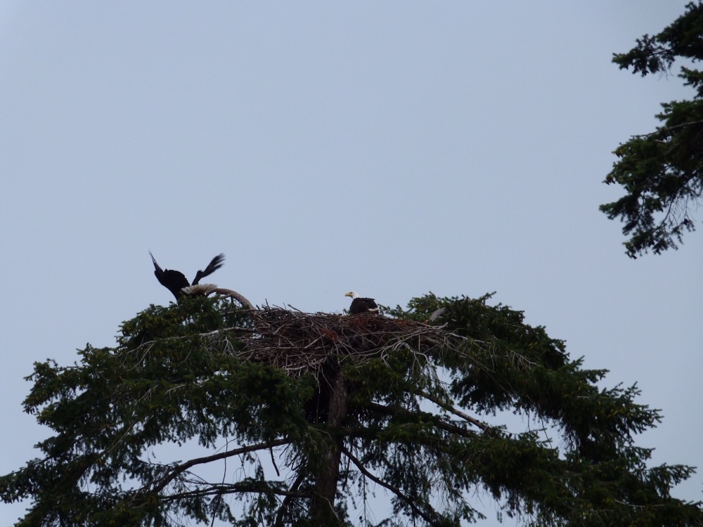 What a wonderful day. The weather was perfect and we did one of our favourite walks in Port Alberni and then had lunch in the Clam Bucket. Decided to pop in to see the Eagles before going home and I’m so glad we did eye put on a show for us followed by another put on by Mummy Merganser and her ducklings. Didn’t think the Eagles were going to do anything but mum eventually appeared, junior popped his head up and then daddy brought something to eat. Then he kept coming back with more! Incredible. The mum then spent a while feeding the baby – although he looks as big as his parents and certainly big enough to feed himself! Mum must have then sent dad out for new bedding as he then appeared with a tree branch and spent a while repairing part of the nest.