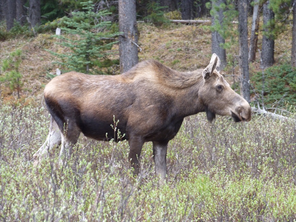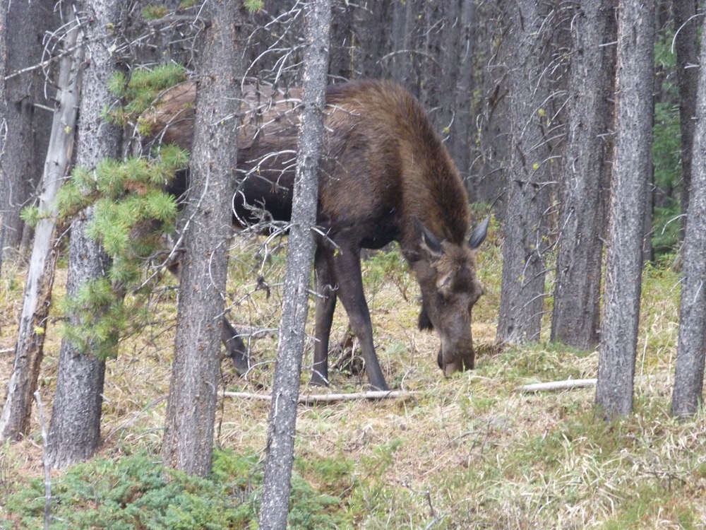Drove up to Maligne Lakeand on the way saw the bald eagles nesting in their usual spot overlooking Medicine Lake in spite of the fact that there was a bad fire there last July. Then we saw what we’ve been trying to see the whole time we’ve spent in Canada – a moose. And not just one but a Mum and her youngster. So excited!