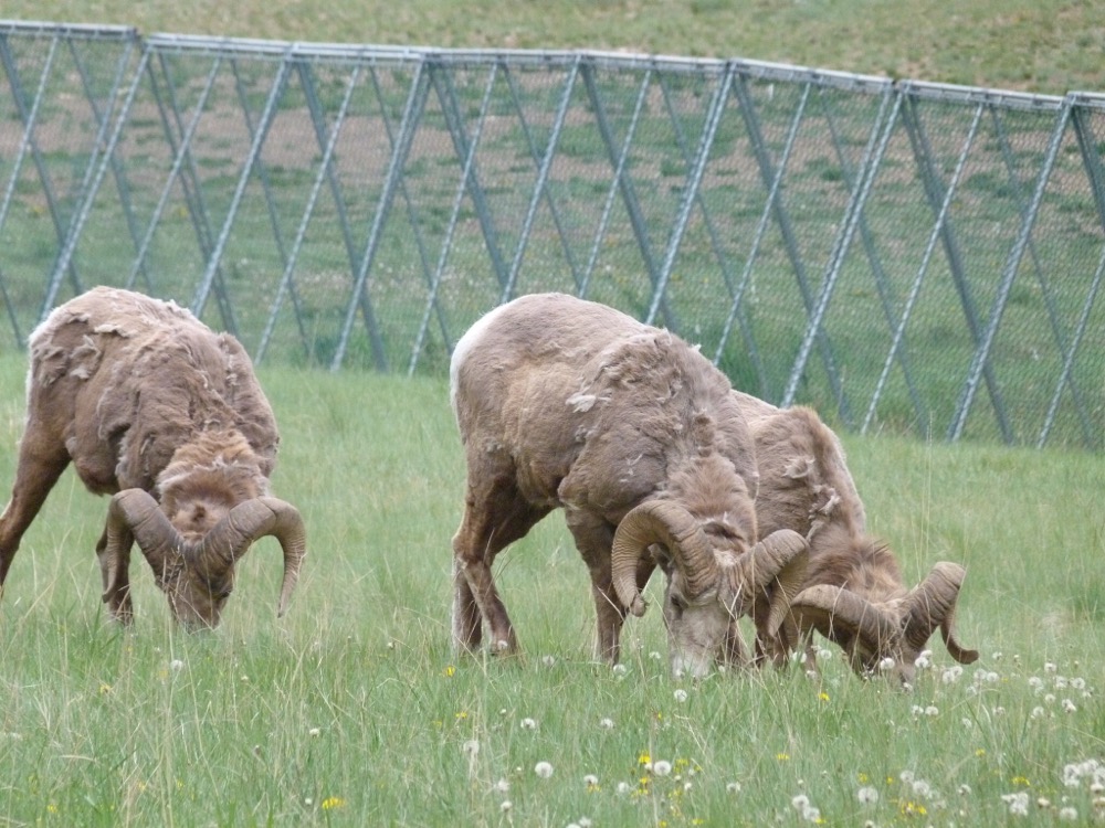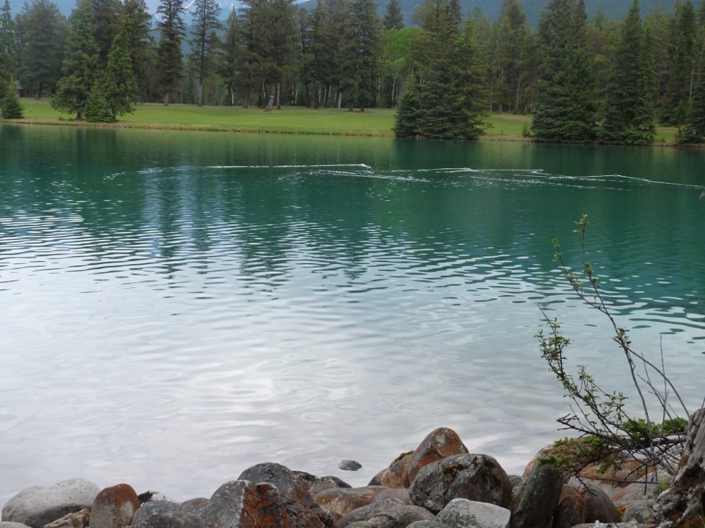 Had a lovely walk around Lake Beauvert this morning in spite of a ratty woman who didn’t want us to walk across the golf course – can’t imagine why! Then drove to the Athabasca Falls – incredible what the power of water can do. After a very nice Greek meal tried driving up the Maligne Lake road but only saw that poor mother eagle sitting on her eggs in the pouring rain. Only animals seen today were a flock of male sheep with very curly horns. They must have been out on the town as they didn’t have any females with them!