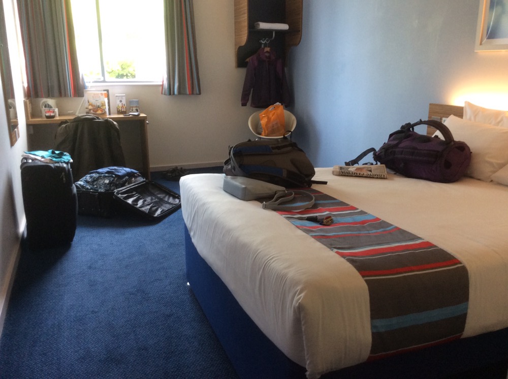 Made it to the airport hotel. Strange room – looks like a burglar has nicked most of the furniture! Everything fitted into the cases (once I’d changed my very posh purple case for an old (but more roomy) black one! Now off for cocktails with one of my beautiful daughters and her fiancĂ©e.