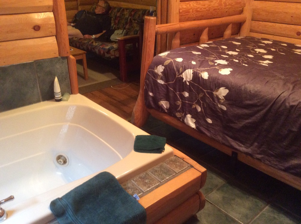 We are now in our very small -or bijou- cabin. It’s lovely but there’s very little space and there’s a big jacuzzi tub in the bedroom leaving no space for anything else as you can see.