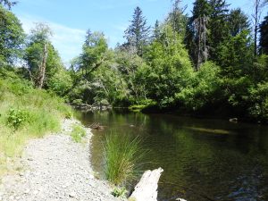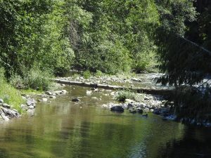 The river with a merganser in the distance.